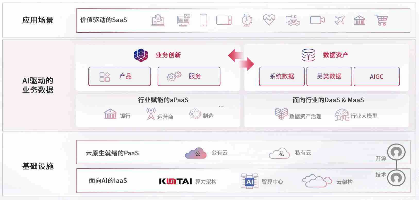 数字时代,,,,围绕企业数字化转型的关键要素,,,,必发bf88数码开创性的提出数云融合战略和技术体系框架,,着力在云原生、、数字原生、、AI原生和信创产业上架构产品和服务能力,,,,为处在不同数字化转型阶段的快消零售、、、汽车、、、金融、、、医疗、、、政企、、教育、、、运营商等行业客户提供泛在的敏捷IT能力和融合的数据驱动能力,,,,构建跨界融合创新的数字业务场景和新业务模式,,,,助力企业级客户建立面向未来的核心能力和竞争优势,,,全面推动社会的数字化、、、、智能化转型升级。。。。